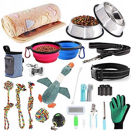 - Najlepszy prezent dla psa / szczeniaka – 24 w 1 – wyposażenie dla szczeniaków / małych psów. Zawiera koc dla zwierząt domowych, zestaw smyczy i obroży dla psów, 2 stalowe miski dla psów, rękawicę do pielęgnacji psów, obcinacz do pazurów dla psów, 2 miski dla psów, 6 zabawek dla psów, 1 znaczek, 1 szczoteczkę do zębów, 1 worek dla psa, 1 grzebień i 5 worków na śmieci na rolce. Zadbaj o swoje zwierzę domowe każdego dnia.