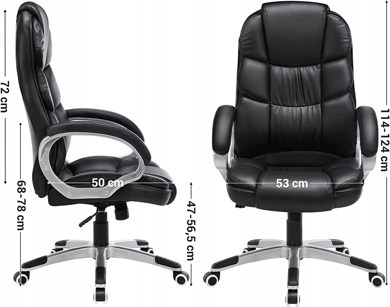 - Wysokość oparcia: ok. 76 cm, powierzchnia do siedzenia: szerokość ok. 55 cm, głębokość ok. 50 cm, bezstopniowa regulacja wysokości siedziska: ok. 46-56 cm, wysokość od podłokietników do podłogi: ok. 68-78 cm