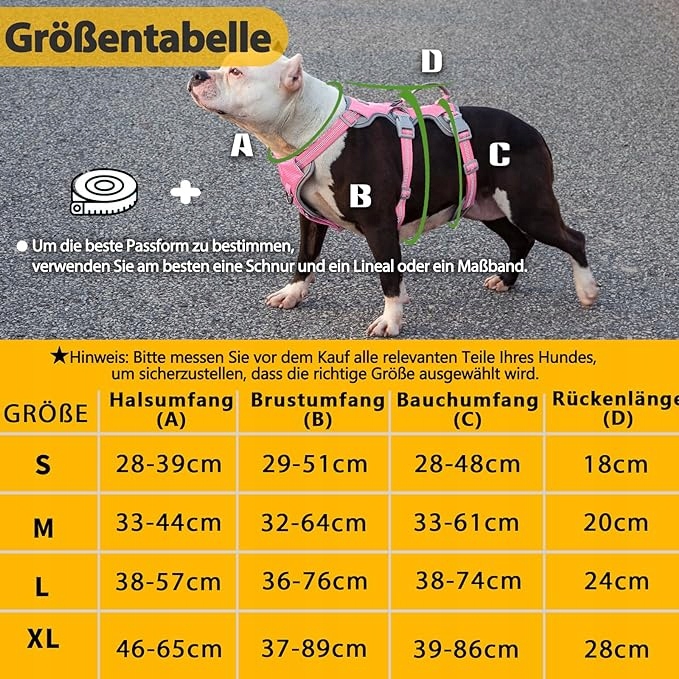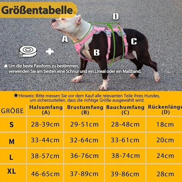 - Uprząż dla psów średniej wielkości (obwód szyi: 13″-17,5″ 33 cm-44 cm, obwód klatki piersiowej: 12,5″-25″ 32 cm-64 cm, obwód brzucha: 33 cm-61 cm, długość pleców: 8″ 20 cm) jest idealna do Pitbull, Labradoodle, Bull Terrier, Jamnika, Bull Terrier itd. Idealna do pitbulla, labradoodle, Bull Terrier, itd. odle, bulterrier, odle, bulterrier, itd.) Odblaskowe paski na uprzęży są zaprojektowane tak, aby zapewnić większe bezpieczeństwo zarówno w dzień, jak i w nocy.