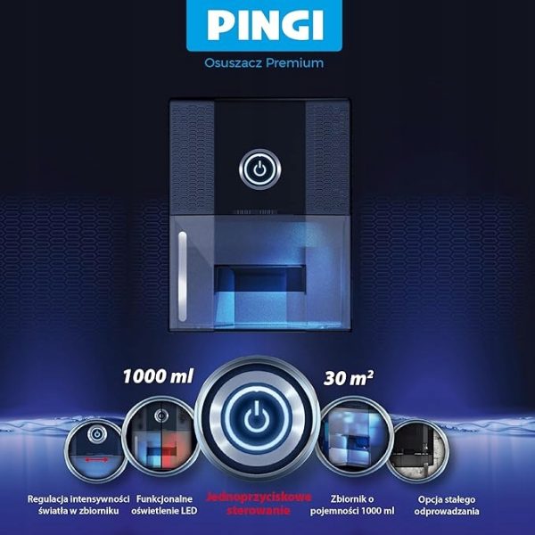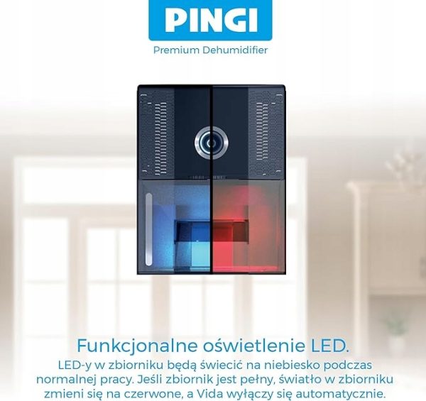 - STYLIZOWANY I OSZCZĘDZAJĄCY MIEJSCE: Nasz osuszacz elektryczny ma elegancką, minimalistyczną obudowę, która wygląda stylowo w każdym otoczeniu. Osuszacz PINGI VIDA jest kompaktowy. Urządzenie ma diodę LED. Diody w zbiorniku świecą na niebiesko podczas normalnej pracy. Czerwony kolor oznacza, że zbiornik jest pełny. Oświetlenie zbiornika i przycisku można przyciemnić do trybu nocnego dla nocnej pracy.