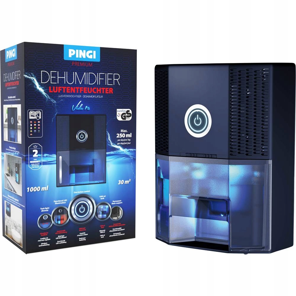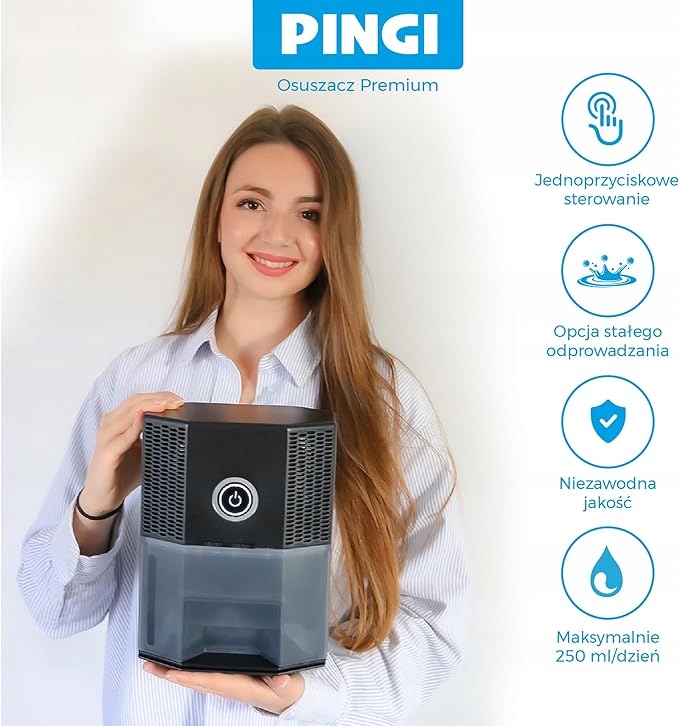 - PREMIUM USUWANIE WILGOTNOŚCI: Innowacyjna technologia osuszania w osuszaczu powietrza PINGI VIDA usuwa nadmiar wilgoci jednym dotknięciem przycisku. Elegancki i kompaktowy osuszacz elektryczny to pierwszy wybór, jeśli chodzi o eliminację niechcianej wilgoci i zapachów. Nasz osuszacz domowy ma pojemność 1000 ml i zbiera do 250 ml wody dziennie, zapewniając suche, przyjemne mieszkanie.
