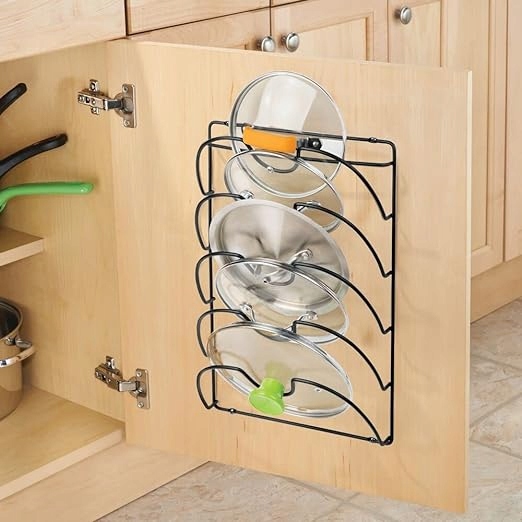 • Zajmuje mało miejsca i jest praktyczny: uchwyt na pokrywkę zapewnia miejsce na maksymalnie pięć różnych pokrywek garnków i patelni. Dzięki temu zapewnia miejsce w szafkach kuchennych na inne przybory kuchenne.