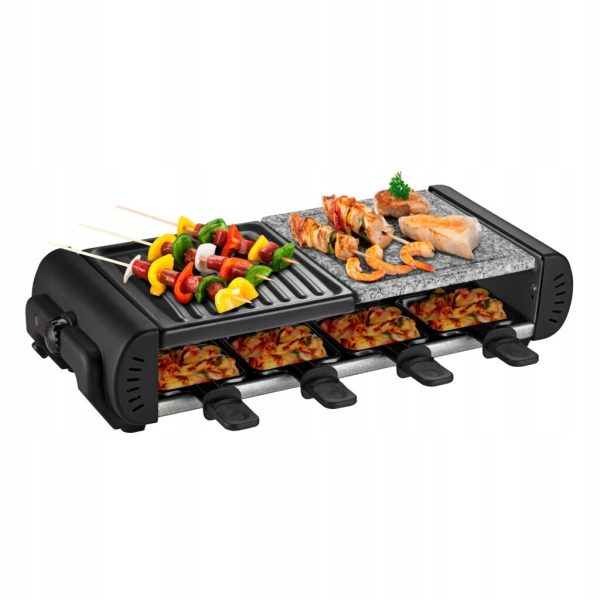 Grill do raclette z powierzchnią grillowania, kamieniem do grilla i patelniami dla ośmiu osób.