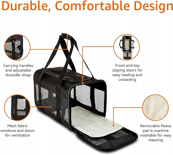 • Duży transporter z miękkimi bokami do wygodnego trzymania zwierzaka podczas podróży lub wizyty u weterynarza.